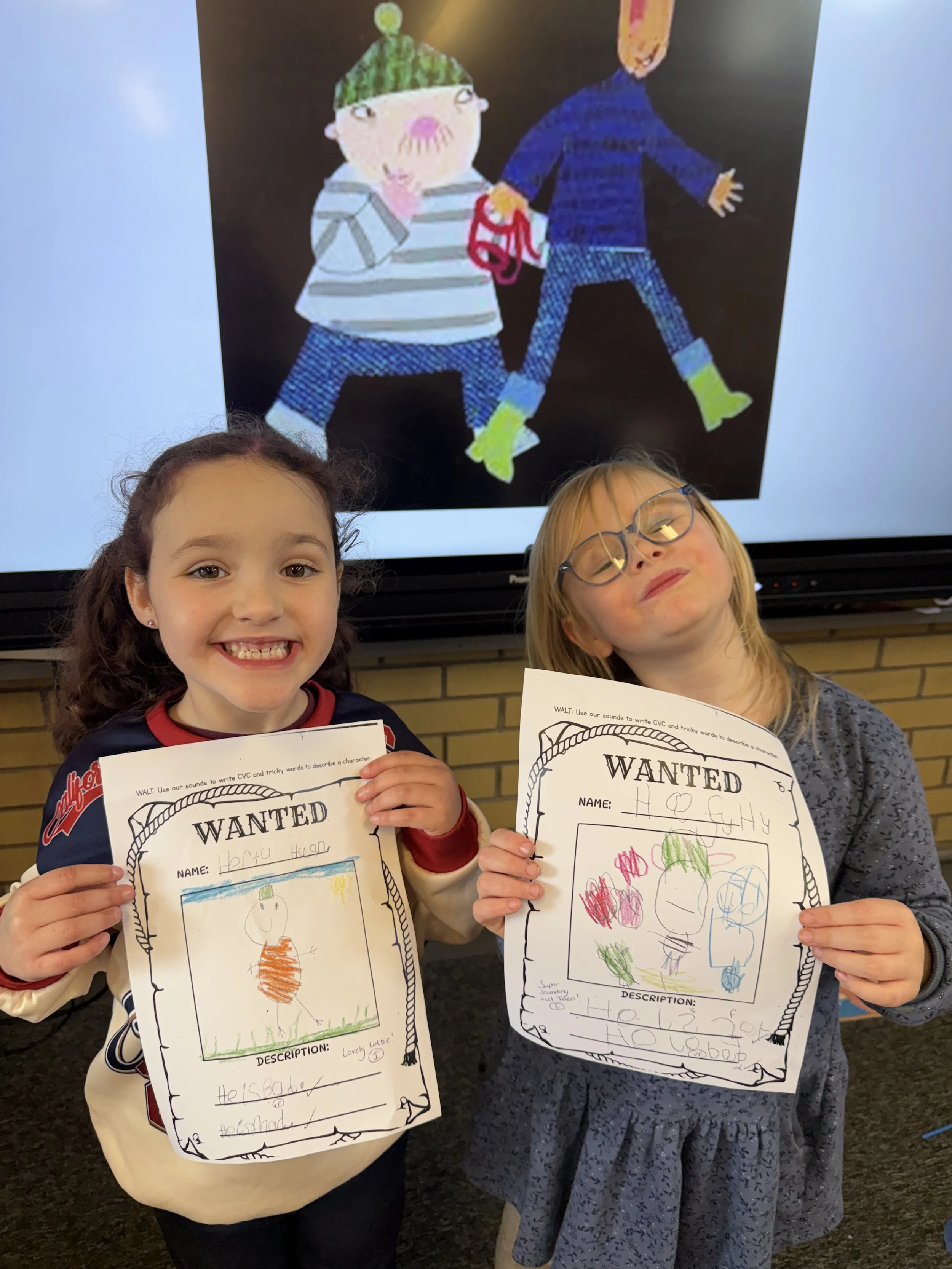 P1 used their phonics skills to write descriptive WANTED posters to catch the robbers from ‘What the Ladybird Heard’ 🐞